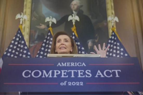 与此同时,众议院也在紧锣密鼓地炮制自己的对华竞争法案。跟参议院一样,众议院的《美国竞争法案》也有个蓝本——《生物经济研究和发展法案》,由得克萨斯州众议员艾迪·强森2021年7月提出,同样因争议较大而被搁置。在众议院议长佩洛西等人的推动下,2022年伊始,该法案糅合先前的“美国芯片法案”“鹰法案”等多部法案,以“美国竞争法案”的新名字再次出现在国会上。2月4日,众议院以微弱优势通过了这部长达3610页的法案。