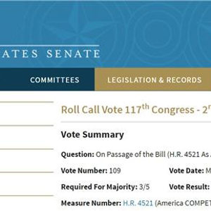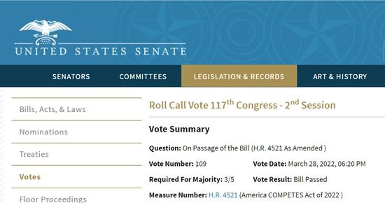 3月28日,美国参议院以68票赞成、28票反对的结果通过2022年《美国竞争法案》。美国参议院网站