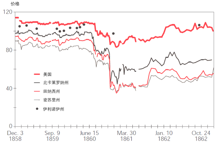 1861年4月,美国南北战争爆发,联邦和州政府债券价格大幅下跌(图1)。巨额的人力和财力的耗费使联邦政府再次面临类似于独立战争和美英第二次战争时期的困境。在持续入不敷出的情况下,政府只能借新债还旧债。政府债券价格持续运行于低位,损害了银行资产负债表,甚至导致部分银行的银行券停止兑付。穷尽一切手段之后只能是发行货币。图1:美国政府债券价格走势(1858年12月-1863年1月)