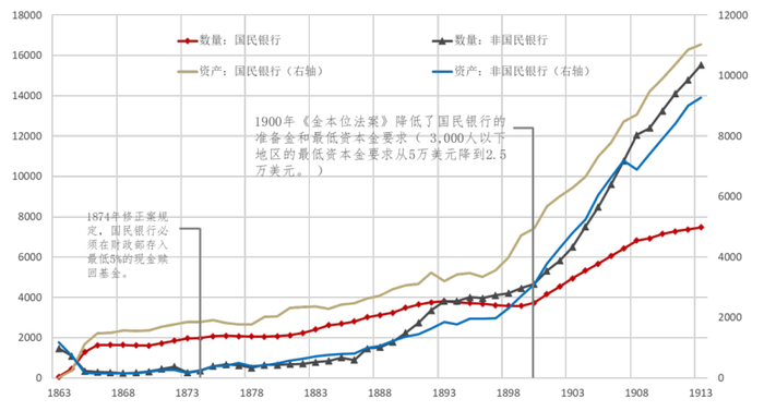 本质上,《国民银行法案》更像是在联邦层面推行自由银行制度,只是在吸取自由银行制度的教训后变得更保守了,申请门槛更高,监管更严。但整体而言,国民银行时代的双层银行体系不是变得更稳定了,而是相反。原因在于: