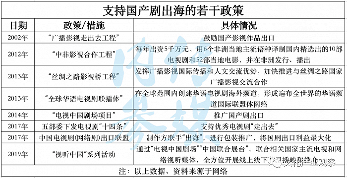政策的鼓励从未停止。从2002年的“广播影视走出去工程”,到“丝绸之路影视桥工程”“全球华语电视剧联播体”“中国电视剧场项目”,再到近几年的“中国电视剧(网络剧)出口联盟”建立,“中国视听节目海外播出推广品牌活动”等,国家广播电视总局实施了一系列“走出去工程”,包含海外展播、合作拍摄、扶持译制等全方位支持。