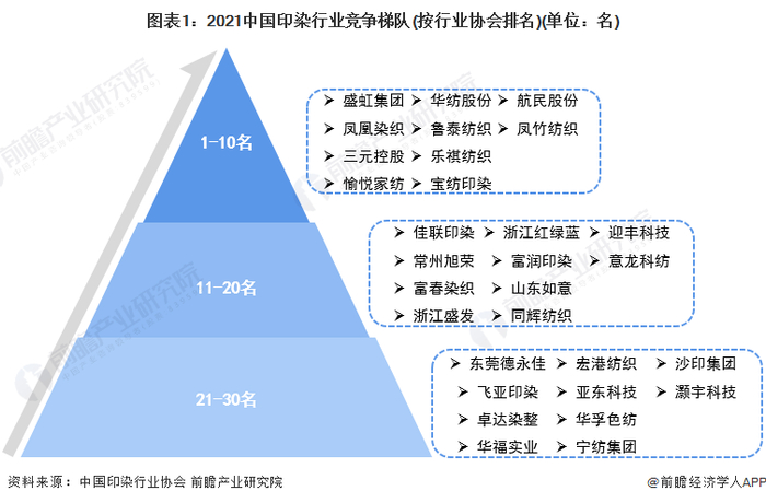2021年5月,为引导我国印染行业企业加快改革创新和转型升级步伐,提高国际竞争力,实现高质量发展,根据企业的申报材料并结合企业生产运营实际,中国印染行业协会综合考评企业规模、经济效益、社会责任、创新能力以及节能环保等情况,颁布了“2021年度中国印染企业30强”。根据企业名次,大致可以划分为三大梯队,具体情况如下:
