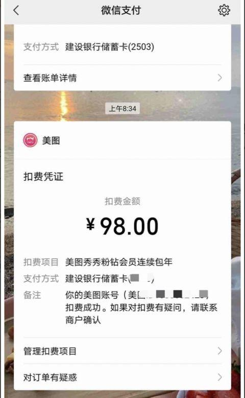几天后,她的手机收到一则微信扣款提示,“交易金额98元”,系统提示,这是“美图秀秀粉钻会员连续包年”的费用,她表示,“我还是一名大学生,平时都没有钱,这突然扣个年费,我完全不能接受”,她说,扣费后,自己的卡上只有125元的生活费了,而这个月还有5天,自己连饭钱都不够了。