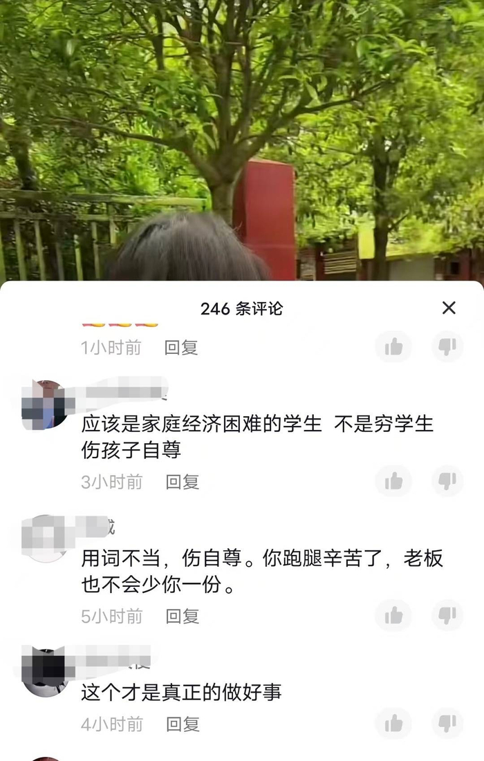 有网友质疑这样的捐赠过程伤害学生的尊严,“不要一边做好事又一边伤人”。也有网友认为“这是实实在在帮助学生,不要钻牛角尖”。