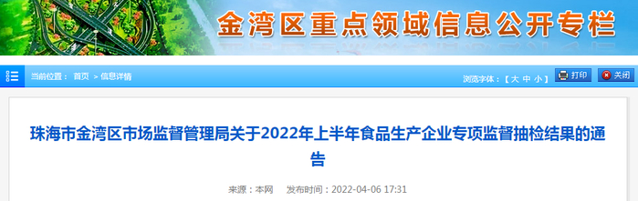 中国质量新闻网讯 近日,珠海市金湾区市场监督管理局发布关于2022年上半年食品生产企业专项监督抽检结果的通告。