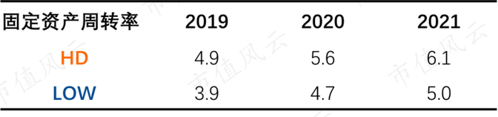 由于固定资产的增速近年来远低于营收增速,使固产周转率上升较快,HD在此方面的表现也是始终优于LOW。