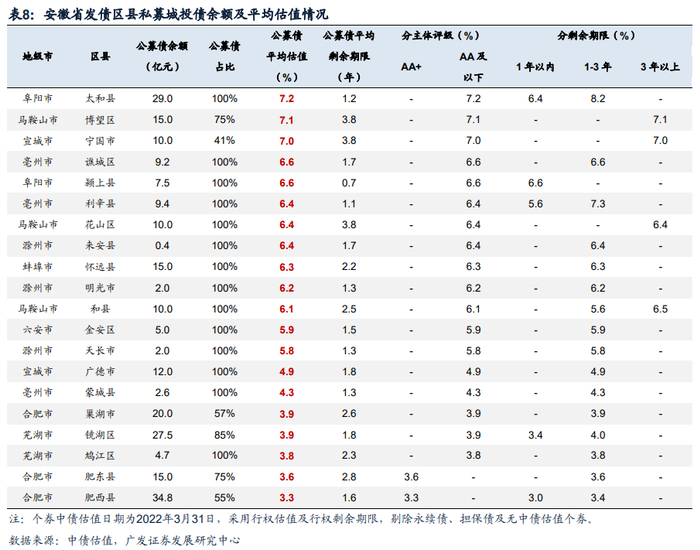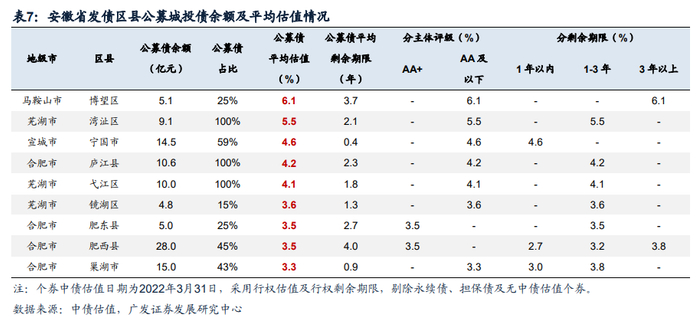 从区县城投公募债平均估值来看,合肥的巢湖市、肥西县、肥东县公募债平均估值较低,分别为3.3%、3.5%、3.5%。其中,肥西县、肥东县2021年一般公共预算收入均超过50亿元,巢湖市为26亿元,增速分别为8.3%、14.4%,9.9%,且增速均较2020年进一步上升。而马鞍山博望区、芜湖湾沚区公募债平均估值较高,分别为6.1%和5.5%,其中马鞍山博望区财力较弱,城投债务率(一般预算财力口径)处于省内中等水平。芜湖湾沚区财力和债务率数据表现相对较好,估值较高可能主要与样本券剩余期限较长有关。