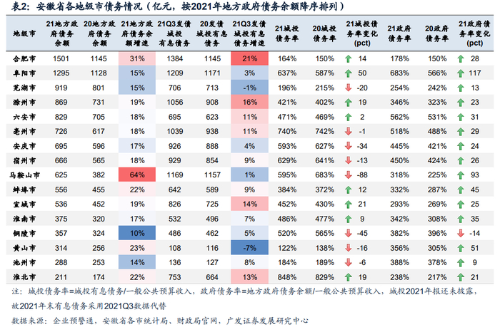 地级市层面,马鞍山市、铜陵市财政数据改善明显,芜湖市、六安市经济数据改善明显。马鞍山市和铜陵市2021年一般公共预算收入增速分别为15.9%、14.4%,排省内前二位,并且两年平均增速分别为11.4%、9.8%,也排省内前二位。芜湖市和六安市2021年GDP增速以及两年平均增速均排省内前二位。债务率方面,安徽16个地级市中,有8个地级市2021年城投债务率(一般预算财力口径)下降,而2021年政府债务率(一般预算财力口径)除铜陵市下降14个百分点外,其余15个地级市均上升。