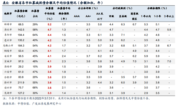 从各市城投私募债平均估值来看,只有芜湖市在3.5%以下,除了芜湖市财力较强且债务率较低外,与样本存量债平均剩余期限较短(1.4年)也有关。六安市、合肥市、滁州市、宿州市次之,为3.6%。其中,合肥市、滁州市2021年一般公共预算收入位列全省前三位,且城投债务率、政府债务率均处于中等偏低水平。而蚌埠市私募债平均估值相对较高,为5.2%。蚌埠市2021年一般公共预算收入、城投债务率、政府债务率均处于全省中等水平,但符合条件的私募债样本券大多为AA平台发行且行政级别较低,因此拉高了整体平均估值。