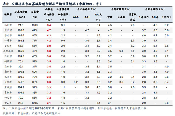 从各市城投公募债平均估值来看,大部分地级市处于较低水平,仅有池州市、淮北市、淮南市、蚌埠市超过4%。黄山市、阜阳市、六安市公募债平均估值相对较低,分别为3.1%、3.2%、3.2%,合肥市、芜湖市、宣城市、亳州市次之,均为3.3%。其中,合肥市和芜湖市财政实力较强,2021年一般公共预算收入位列全省前三,并且城投债务率、政府债务率(一般预算财力口径)均处于省内较低水平。此外,宣城市、亳州市、阜阳市、六安市财力处于省内中等水平。宣城市政府债务率(一般预算财力口径)较低,且样本存量债剩余期限较短,大多为1年以内。亳州市、阜阳市、六安市政府债务率(一般预算财力口径)相对偏高,但平均估值较低是因为剔除担保债和永续债后的样本券,均为市级平台发行。