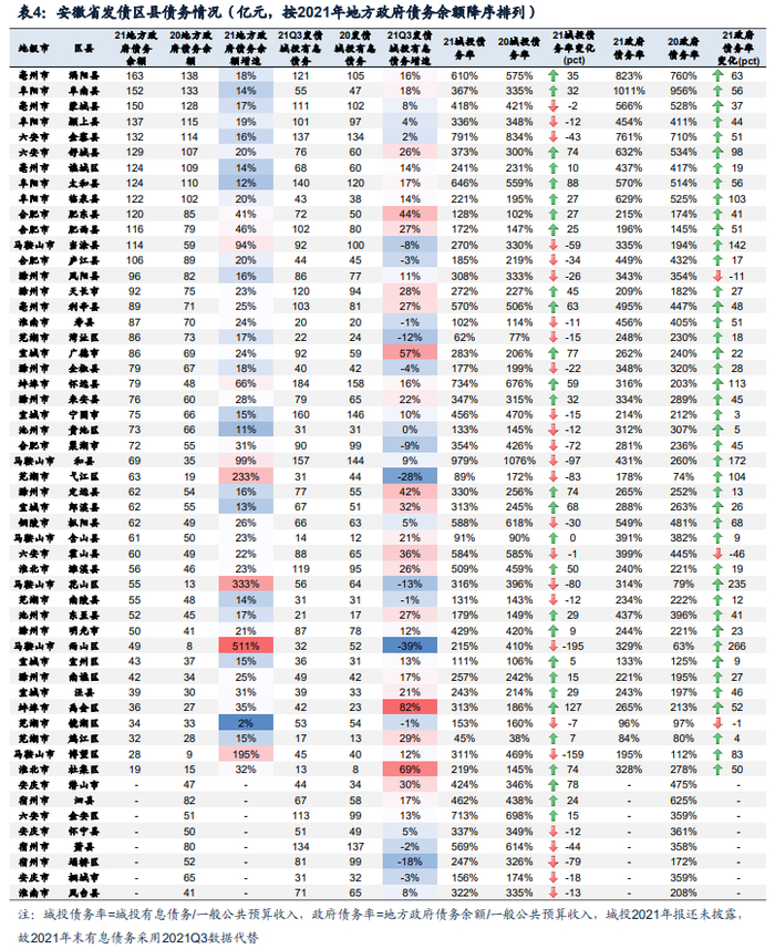 地级市层面,马鞍山市、铜陵市财政数据改善明显,芜湖市、六安市经济数据改善明显。区县层面,安徽多数发债区县财力相对较弱,54个发债区县中仅有13个一般公共预算收入位于30亿元以上。债务负担方面,一半区县2021年城投债务率较2020年下降,仅3个区县2021年政府债务率下降。