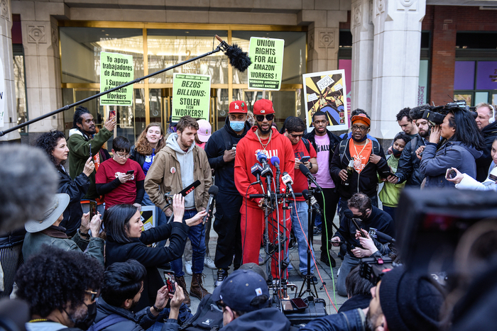 2022年4月1日,美国纽约,亚马逊工会创始人Christian Smalls与亚马逊工人一起庆祝并发表讲话。当日,美国纽约斯塔滕岛(Staten Island)的亚马逊员工投票决定是否成立亚马逊工会。如果工会最终成立,标志着亚马逊将成为历史上第一个成功成立工会的美国公司。