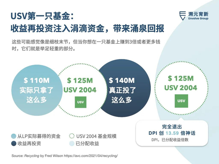 在收益再投资这一点上,USV一直非常积极。Fred Wilson认为,有时候也可以利用收益再投资,让基金的实际资金比募到的钱更多。比如USV第一只正式问世的基金,公布的规模是1.25亿美元,但他们只从LP那募到了大概1.1亿美元,不过最终这只基金投入了大约1.4亿美元。GP最后实际投出去的钱,可能会比从LP手上call到的款更多。