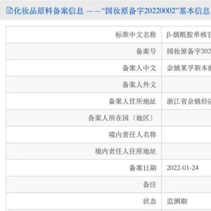 中国新闻周刊注意到,在国家药监局化妆品原料备案信息中,另有一条康盈红莓(中山)生物科技有限公司以NMN作为化妆品原料的备案,备案日期为3月29日。