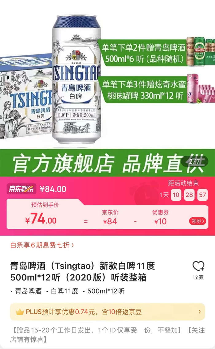 “原酿花香,我的生活美学”……青岛啤酒推出樱花版白啤,一改平日冷色朴素的外观,选择将瓶身设计为樱花点缀的柔美风格。在价格方面,12听500毫升装的樱花版白啤在电商平台售价106元,凑单优惠后,最低也要91元。另一款同样规格的蓝白版包装白啤售价则为84元,使用优惠后,最低仅为74元,单笔下单多件还另有赠品。记者询问客服樱花版白啤是否为樱花味,对方答复称“不是,跟蓝白版只是包装不同。”