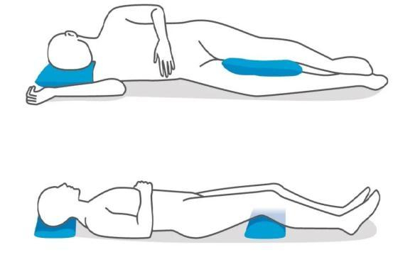 侧卧:头颈侧卧在枕头上,膝关节微屈,腰下或膝关节下方同样可以垫软枕,使脊柱完全放松。