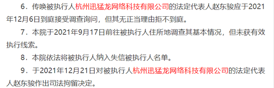 不仅如此,2021年9月,因劳动争议仲裁,迅猛龙法定代表人赵东骏被杭州市滨江区人民法院限制高消费。2021年12月,同样因劳动争议仲裁,赵东骏新增数条被限制高消费,之后成为失信被执行人。