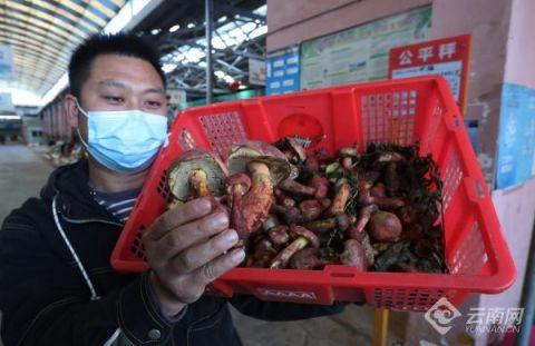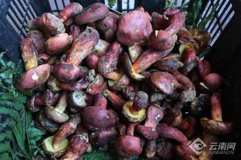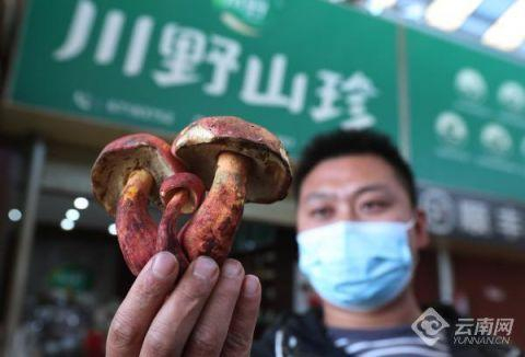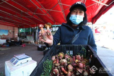 在云南木水花野生菌交易市场,来自文山的红见手青牛肝菌已经开始上市销售,这也是今年第一批上市的“头水菌”。