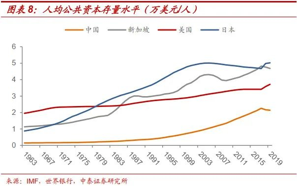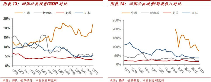 从公共投资占GDP的比例看,2019年我国为22%,高于新加坡1984年水平(16%)、美国1968年水平(6%)和日本1978年水平(12%)。