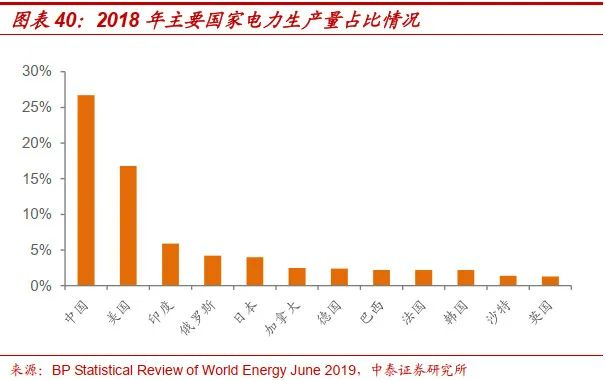 根据《BP Statistical Review of World Energy June 2019》,中国是世界上电力生产最多而且增幅最大的国家,2018年发电量高达7111.8TWh,占世界总量的26.7%;相比之下,美国2018年发电量为4460.8TWh,同比增长3.7%,占全球总量的16.8%。