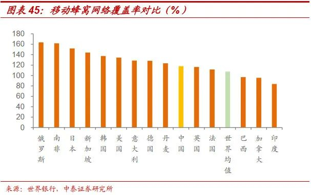 我国移动端通信条件处于较高水平。移动蜂窝网络覆盖率高于世界均值10%。2020年中国移动蜂窝网络覆盖率为118%,高于英国(116%)、世界均值(107%)、巴西(97%)等。