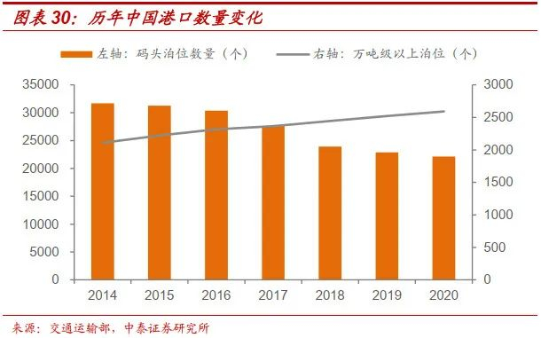 2014年以来,我国沿海建设投资额呈下降趋势,新增各类泊位数量逐年下降。不过,随着各类港口整合的持续深入,我国万吨级以上港口泊位数量持续增长。截至2020年底,全国港口拥有生产用码头泊位22142个,比上年末减少751个。其中,万吨级及以上泊位2592个,比上年末增加72个,万吨级及以上泊位占比由2014年的6.7%提升至2020年的11.7%。