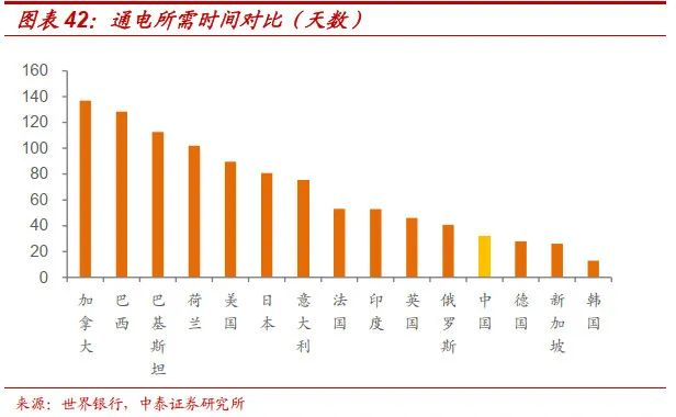 我们比较通电所需时间来判断电力基础设施运营部门提供相关服务的效率。2019年,在中国通电所需时间为32天,大幅低于世界平均水平(82天),同时低于中高等收入国家平均水平(78天)。而美国、德国、日本的通电所需时间分别是89.6天、28天、80.9天,我国在电力基础设施服务效率方面表现较好。