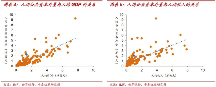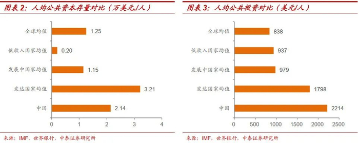 我国基建存量和新增投资“双第一”。2019年,我国公共资本存量(不变价)高达30.19万亿美元,位列世界第一,当年公共投资规模(不变价)为31240亿美元,同样位列世界第一。即使考虑到我国人口基数庞大,从人均角度看,基建水平同样排名靠前。2019年人均公共资本存量和人均公共投资分别排名全球第37位和第13位。