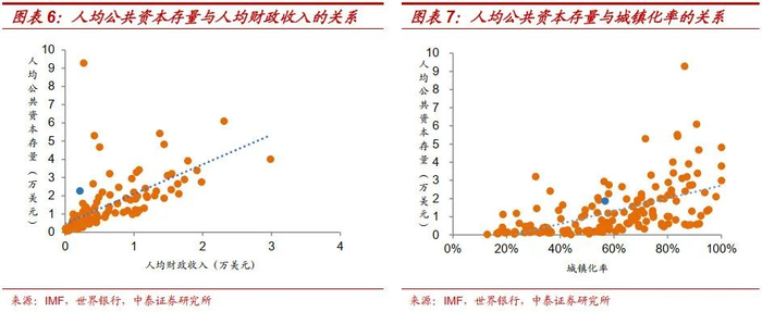 相较于其他经济社会发展指标,我国基建发展明显超前。我们通过对比人均GDP、人均收入、人均财政收入、城镇化率等四个指标,来衡量我国当前人均公共资本存量规模是否合理。理论上讲,这四个指标越高的国家,对应的人均公共资本存量也应该越高。从样本数据拟合结果看,人均公共资本存量与人均GDP、人均收入、人均财政收入、城镇化率均呈显著正相关。不过,我国目前人均公共资本存量明显高于拟合值,意味着基建发展水平超前于其他经济社会发展指标。