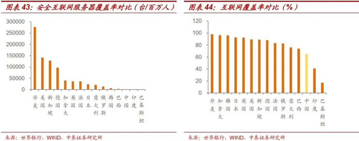 通信:仍有较大提升空间。2020年中国每百万人仅拥有948台安全互联网服务器,在样本国家中仅高于印度和巴基斯坦,相当于第一名丹麦的0.3%;中国每百人仅有65人使用互联网,而丹麦、加拿大和韩国等国个人互联网使用率高达95%以上。不过,我国移动端通信条件较好,移动蜂窝网络覆盖率高于世界均值10个百分点。