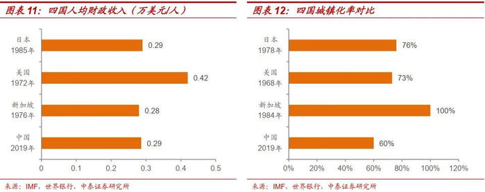 从城镇化率看,2019年中国城镇化率为60%,低于新加坡1984年水平(100%)、美国1968年水平(73%)、日本1978年水平(76%)。