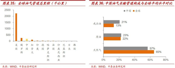 截至2021年,中国油气管道总里程累计约为16.5万公里,排名世界第三,其中天然气管道里程全球排名第四。目前全球油气长输管道总里程约191.9万公里,其中天然气长输管道里程数约124.46万公里,占比64.8%,原油、成品油长输管道占比分别为22.04%、13.16%。按地区排名,北美是长输管道里程最多的国家。单纯从天然气管道来看,世界排名前五的分别是美国、俄罗斯、加拿大、中国和阿根廷。