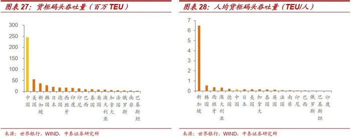 港口集装箱吞吐量衡量的是通过陆运到海运(反之亦然)方式运输的集装箱流量,以20英尺当量单位的标准尺寸集装箱为计算单位。根据世界银行最新数据,2017年中国货柜码头吞吐量(245百万TEU)达世界第一,远超其他国家。从人均水平看,中国和主要发达国家基本一致,2017年人均为0.17 TEU,与德国、日本和美国相近。
