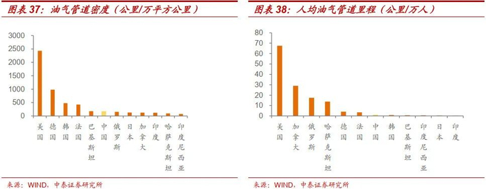从密度和人均水平看,2021年中国管道密度为175公里/万平方公里,与巴基斯坦(178公里/万平方公里)、俄罗斯(154公里/万平方公里)相当,但远低于美国(2432公里/万平方公里)、德国(983公里/万平方公里)等主要发达国家;中国人均管道长度为1.17公里/万人,同样明显低于北美和欧洲主要发达国家。