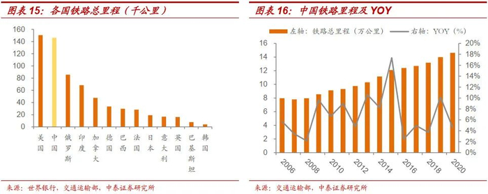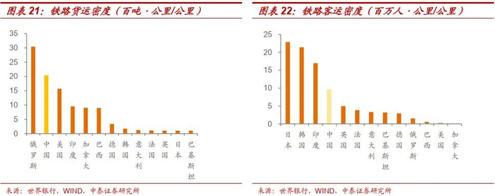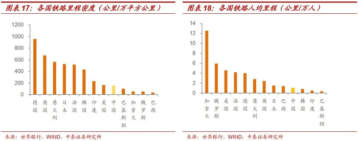 我国铁路密度和人均铁路里程跟主要发达国家差距较大。从铁路里程密度来看,在世界主要国家中,中国(150.03公里/万平方公里)仅高于巴基斯坦(101.06)、加拿大(53.2)、俄罗斯(52.3)、巴西(35.7),较德国、英国等发达国家有较大差距,甚至低于印度(230.2);从铁路人均里程来看,中国(1公里/万人)仅高于韩国(0.81公里/万人)、巴基斯坦(0.35公里/万人),低于印度(0.5公里/万人),与发达国家有较大差距。