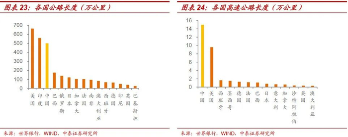 截至2020年,我国公路总里程排名世界第三,共计501.25万公里,仅次于美国和印度;同时高速公路总里程排名世界第一。不过,我国公路总里程密度和人均里程仅高于个别样本国家,与大多数发达国家差距较大。