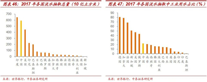 在淡水抽取总量上来看,中国2017年抽取5918亿立方米淡水,排名世界第二;2017年中国工业用水抽取淡水占总抽取量的22.3%,与俄罗斯、西班牙接近,远低于德国(80%)和加拿大(78%)。