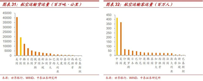 交通运输:人均规模偏低。截至2020年底,我国铁路运营总里程为14.63万公里,位列世界第二,但铁路密度和人均铁路里程与主要发达国家差距较大;我国铁路货运密度和客运密度分别位列世界第二和第四;公路总里程达501.25万公里,达世界第三,但我国公路总里程密度和人均里程仅高于个别样本国家,与大多数发达国家差距较大;2017年中国货柜码头吞吐量(245百万TEU)达世界第一,人均水平也与主要发达国家一致;2020年航空货运量排名世界第二,客运量排名世界第一,但人均水平均低于主要发达国家。