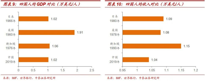 从人均GDP(不变价)看,2019年中国人均GDP为1.02万美元,相当于日本1966年的水平(1.02万美元),低于美国1960年水平(1.91万美元)、新加坡1976年水平(1.06万美元)。