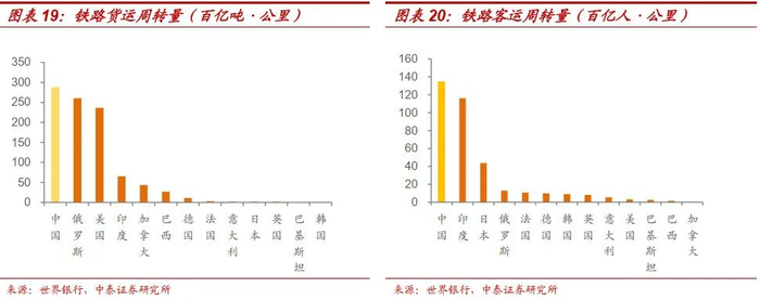 我国铁路货运周转量和客运周转量均居世界第一。货运周转量为实际运送的货物吨量与其运输距离的乘积,2018年中国铁路货运周转量达288.21百亿吨·公里,较俄罗斯、美国分别高出11%和22%,远超世界其他主要国家;客运周转量为实际运送的旅客人数与其运输距离的乘积,2017年中国铁路客运周转量达134.57百亿人·公里,较第二名印度高出16%,是第三名日本的3倍多。