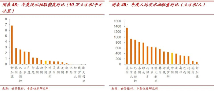 从密度上看,2017年我国淡水抽取密度为6.3万立方米/平方公里,与德国。西班牙接近;我国2017年人均淡水抽取量为419立方米/人,远低于北美,与韩国、俄罗斯、法国等国接近。
