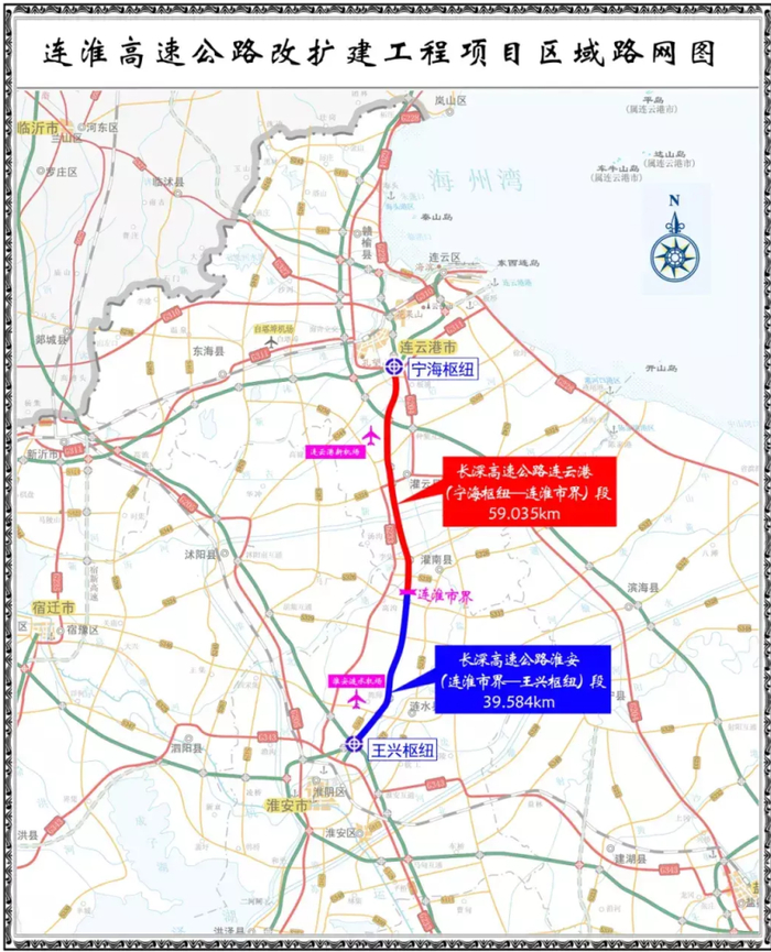 项目概况:本项目路线起自连云港市海州区宁海枢纽北,经灌云、灌南、涟水,止于淮安市淮阴区王兴枢纽北,全长约 98.6 公里,全线设计速度 120 公里/小时,按照双向八车道高速公路标准扩建,路基宽度 42 米,建设工期 3.5 年。