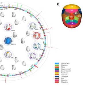 研究团队利用多变量典型相关分析,定位了244个影响东亚群体头面部形态的遗传变异,证实面部特征作为典型的复杂性状由多基因共同影响。此后,他们与欧洲团队合作,进一步发现亚欧人群之间的差异信号可能功能同质,只是因为频率变化所造成的。