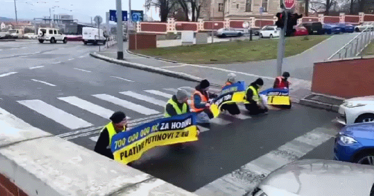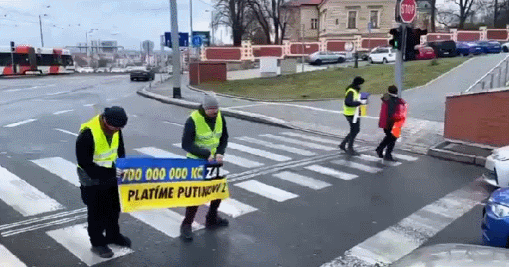 根据视频,其中一个横幅上的标语是,“我们每小时从欧盟支付普京7亿捷克克朗(700 000 000 Kč za hodinu platíme Putinovi z EU)。”还有一个标语显示,“为乌克兰开展3°C运动,让我们立即就行动起来(3 °C pro Ukrajinu–jednejme ted)。”这些人开展的所谓“3°C”运动,是为了要求政府降低对俄能源依赖,从而“不资助普京”。