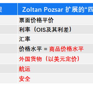 这一背景下,为更好地衡量真实商品价格领域对货币的影响,Pozsar 将 Perry Mehrling 的货币四价框架扩展成了“四价四柱”框架:票面价格平价、利率、汇率(隔夜掉期指数及其利差)、价格水平(商品价格水平)、外国货物(以美元定价)、航运和安全,如下图所示: