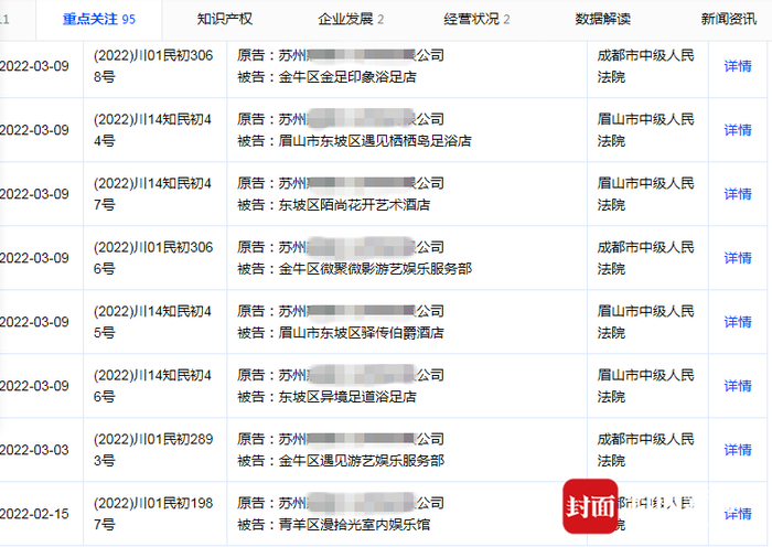 4月8日,封面新闻记者通过网络检索发现,在四川省范围内,被苏州某公司告上法庭的企业,目前已涉及数十家。公开资料显示,从今年3月以来,该公司作为原告起诉的民事案件已立案的信息,在全国范围内已有50条。