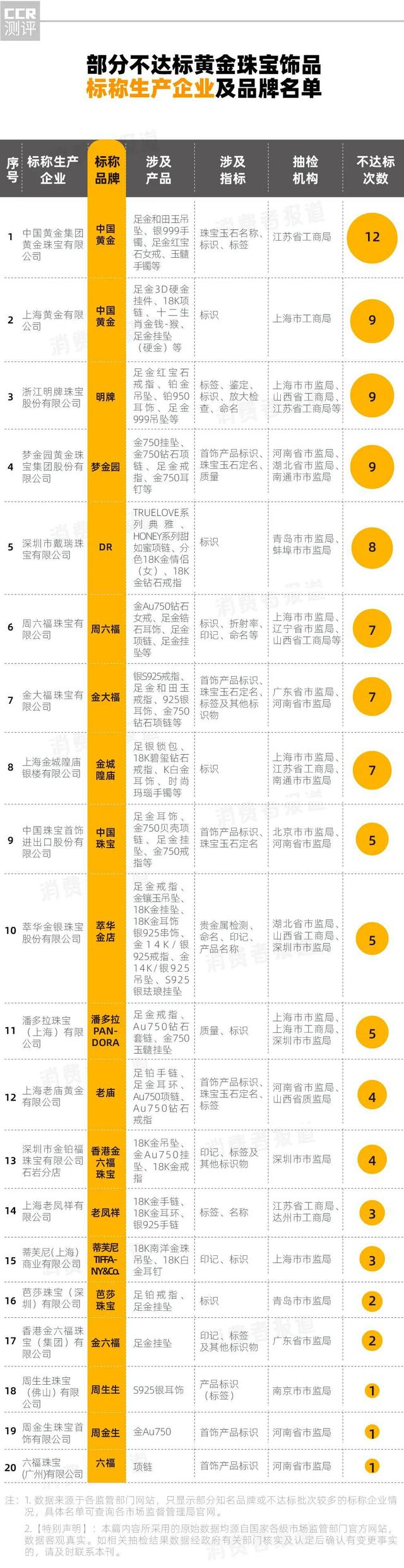 其中中国黄金集团黄金珠宝有限公司和上海黄金有限公司生产的“中国黄金”饰品分别被检出12批次和9批次不达标,是抽检出现不达标情况较多的生产企业。
