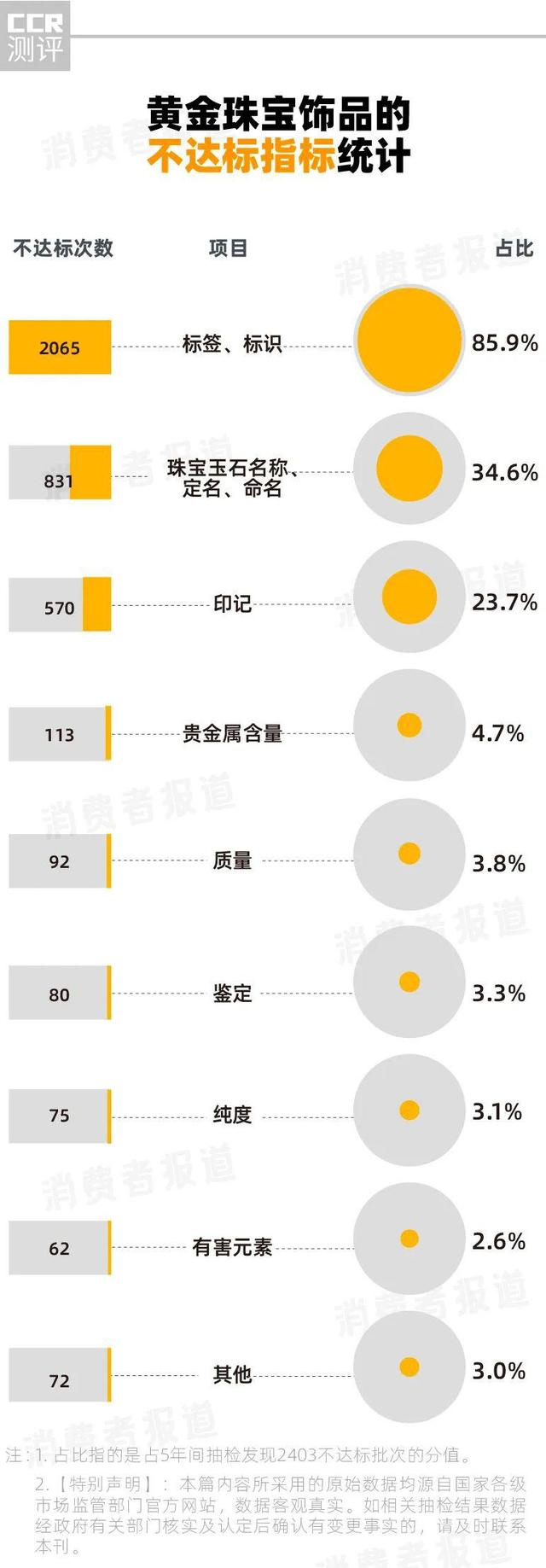 结果显示,5年间,国家、省级监管部门共抽检发现2403批次黄金、珠宝首饰不达标,其中标签、印记、命名、含量、纯度、有害元素不达标情况较严重,周六福、周生生、金大福、DR、潘多拉PANDORA、蒂芙尼、中国黄金等大品牌上“不达标黑榜”。
