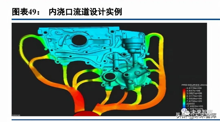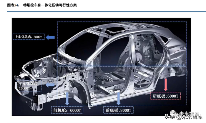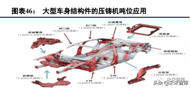 铝压铸工艺综合优势突出,一体化压铸趋势逐步凸显。在不同的轻量化材料中,铝合金的性能、密度、成 本和可加工性等综合优势突出,与多种金属合金和碳纤维相比是极具性价比和技术成熟度的轻量化材料。在制 造工艺中,高压压铸产品在高压下成型,具有致密性高、产品强度及表面硬度高、表面光洁度好等优势,适合 生产复杂、薄壁的各类结构件。当前汽车技术迭代和产能提升需求不断加速,铝压铸方案综合优势明显。随着 新型铝合金材料和大型压铸设备的研发攻关不断取得突破,车企和压铸厂商已经开始陆续布局大吨位压铸机, 一体化压铸技术的成熟度快速爬坡。随着大吨位压铸机的落地投产,采用一体化压铸技术生产大型车用结构件 的趋势将更加清晰。一体化压铸技术可以生产更加复杂的结构件,从而为轻量化设计提供更可靠的生产工艺。(报告来源:未来智库)