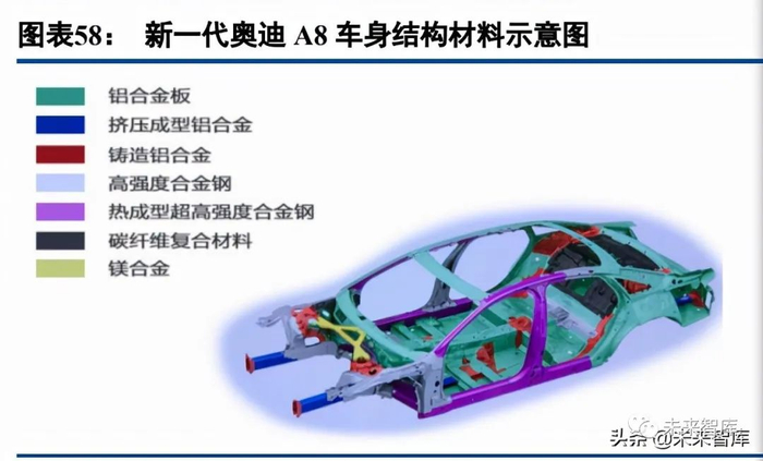 基于空间架构技术的研究,大众率先实现全铝车身量产。大众是全球率先尝试轻量化的车企,通过奥迪空 间架构技术(ASF)优化车架结构,并在关键部位应用超高强度材质,非承重部位使用轻量化材料来达到整车 轻量化的目的。大众集团不同品牌的市场定位不同,应用的轻量化材料各异:奢华跑车保时捷大量应用碳纤维 和铝合金材料;奥迪等豪华型车采用铝、镁合金等轻量化金属;桑塔纳等经济型车则采用高强度钢板代替传统 钢板。大众旗下奥迪是全球第一个实现全铝车身量产的车企,早在 1982 年奥迪就开始研究“高度铝制轿车”项 目,1987 年首款应用全铝车身技术的奥迪 V8 量产,1993 年法兰克福车展上奥迪 A8 横空出世,此后二十余年 逐步将全铝车身技术推广至其他车型。